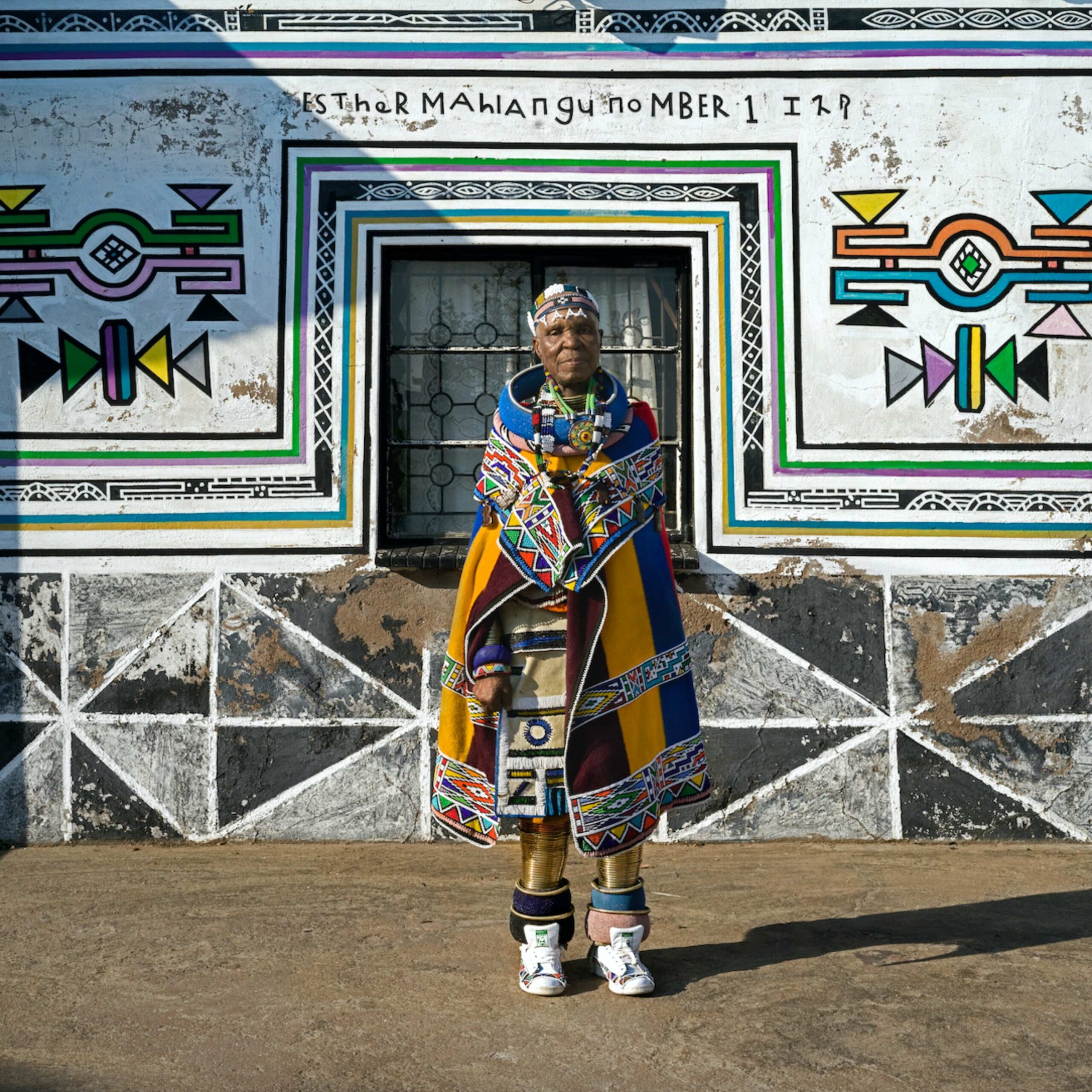 Born in 1935 in South Africa’s Mpumalanga Province, Mahlangu was introduced to the art of Ndebele mural painting at an early age by her grandmother. Within Ndebele culture, mural painting is not simply decorative; it is a sacred practice passed from one generation to the next. Each pattern and colour tells a story, symbolising identity, unity, womanhood, and spiritual continuity.